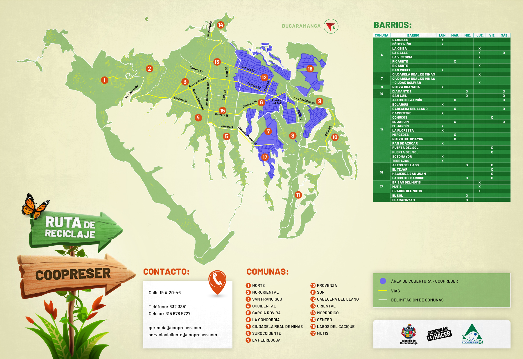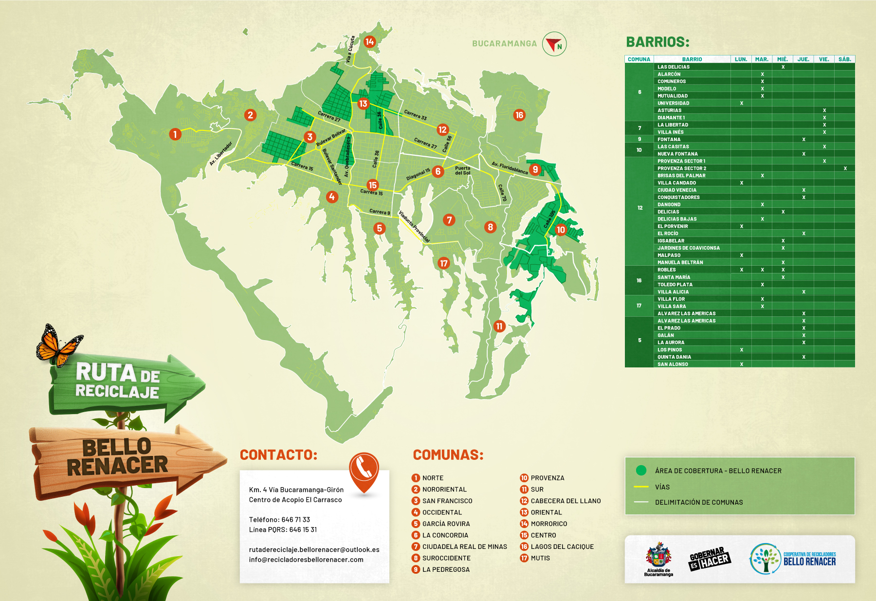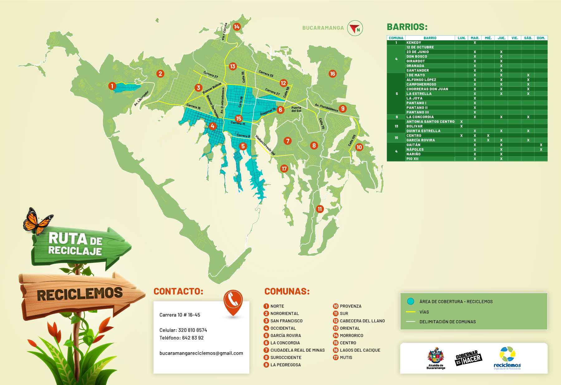 Toma nota y descarga la imagen que corresponda a tu barrio o el área que te quede más fácil para disponer tu material reciclado. En cada pieza encontrarás diferentes datos para ayudarte, como los días y contactos: