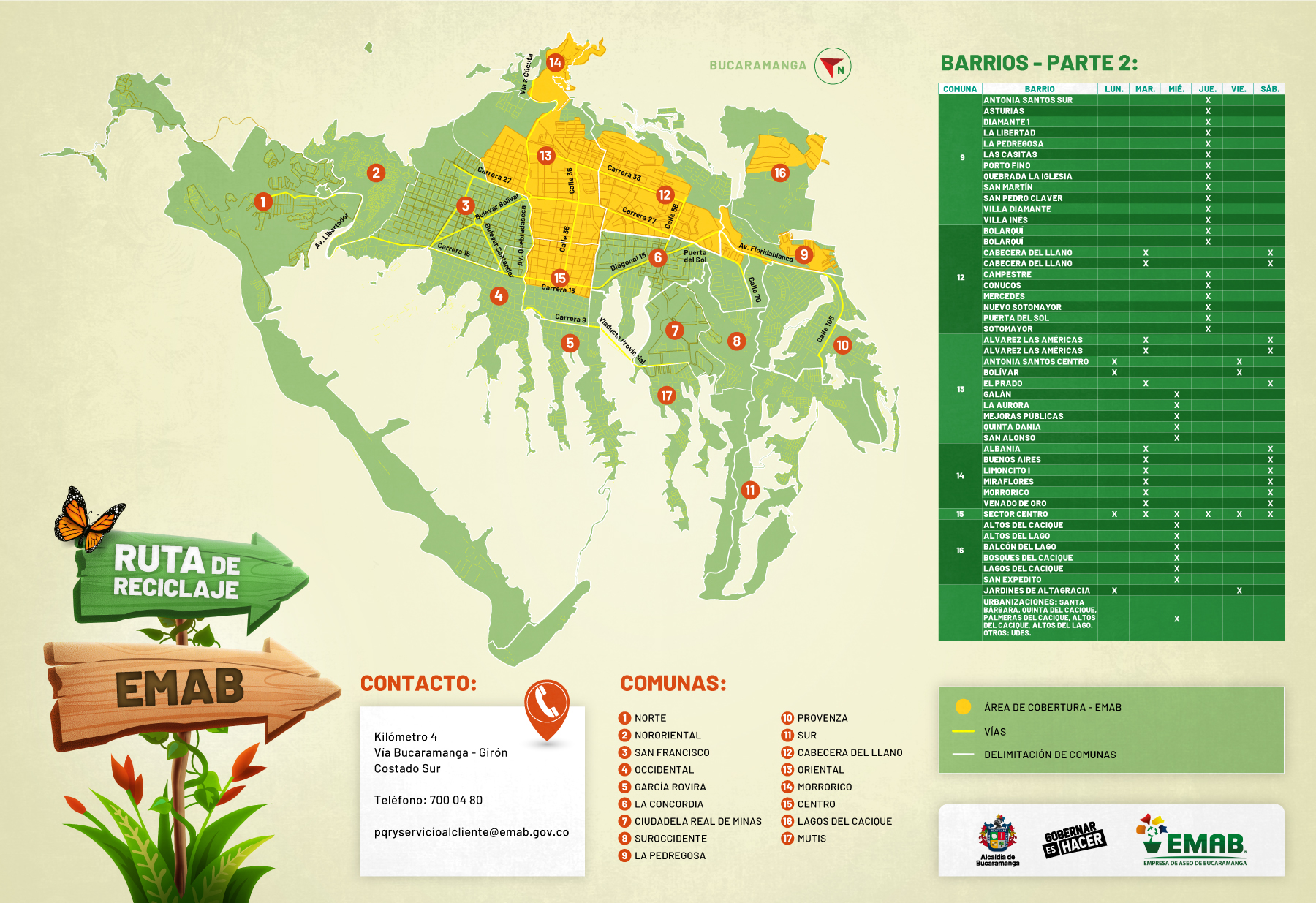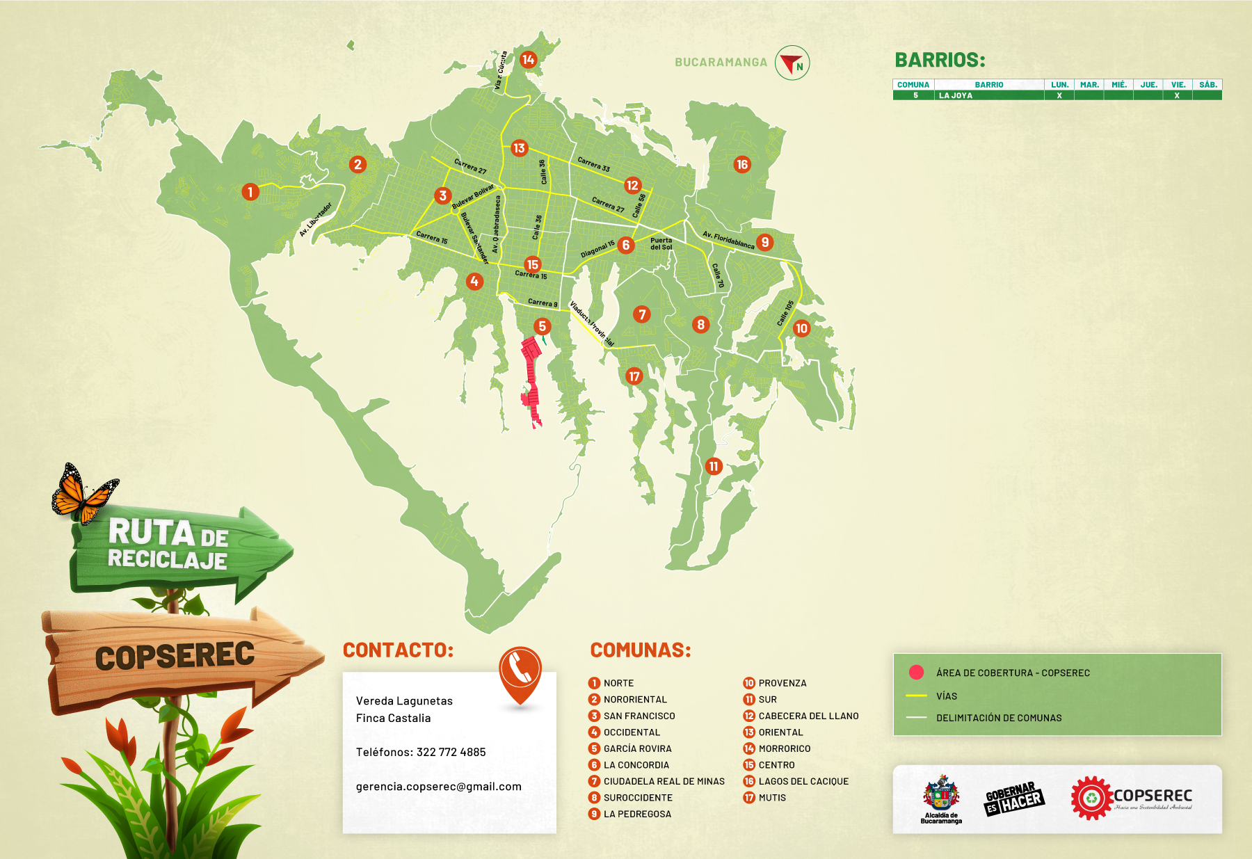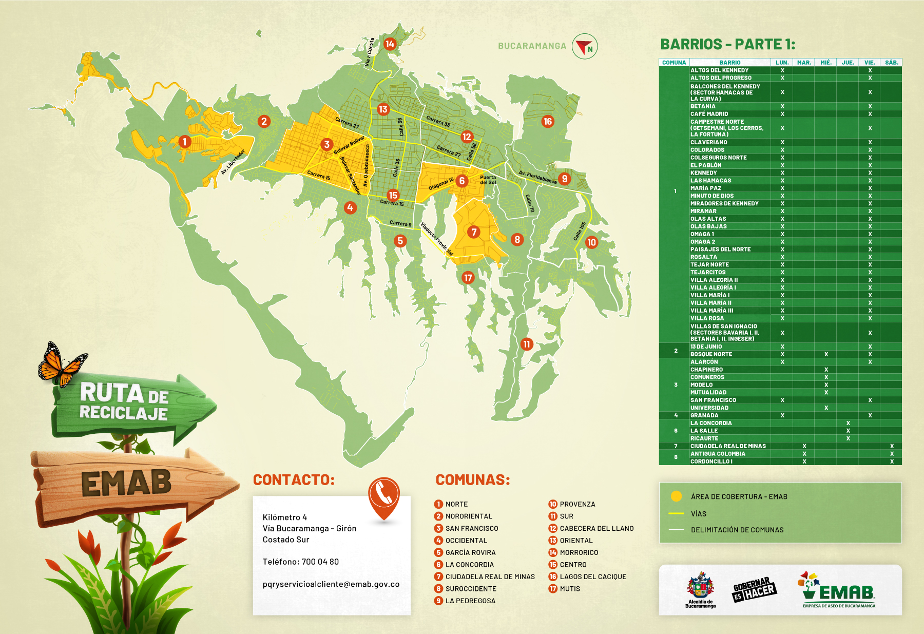 Toma nota y descarga la imagen que corresponda a tu barrio o el área que te quede más fácil para disponer tu material reciclado. En cada pieza encontrarás diferentes datos para ayudarte, como los días y contactos: